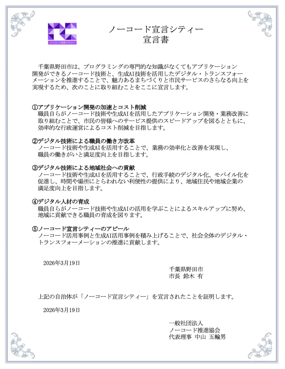 2026年3月19日(木)、一般社団法人ノーコード推進協会(代表理事:中山五輪男、アステリア(株) CXO(最高変革責任者)、以下NCPA) はNCPAの地方創生部会が主導するプログラム「ノーコード宣言シティー」において新たに千葉県として初の千葉県野田市が加盟し、宣言自治体数が22に達したことを発表します。なお今回の宣言におきましてはノーコードのみならず生成AI技術の活用も視野にいれた自治体DX実現を目指す内容の宣言となっており、これは全国としては初の宣言となります。